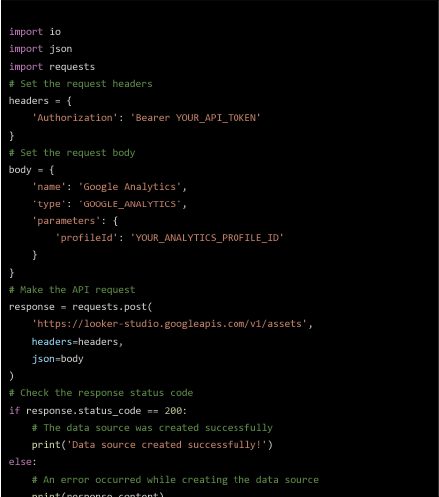 Integrating data sources like Google Analytics into Looker Studio is now automated using the LLM. Here’s the code snippet to add data sources: