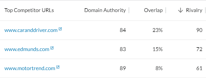 These are Ford’s #1, #2, and #5 competitors, and they aren’t automakers — they’re automotive content producers. Does this mean that Chevy and Tesla aren’t Ford’s competitors? Of course not. It means that those automakers are infrequently appearing in SERPs alongside Ford. Ford is competing with mentions of their own products (makes and models) in leading online publications.
