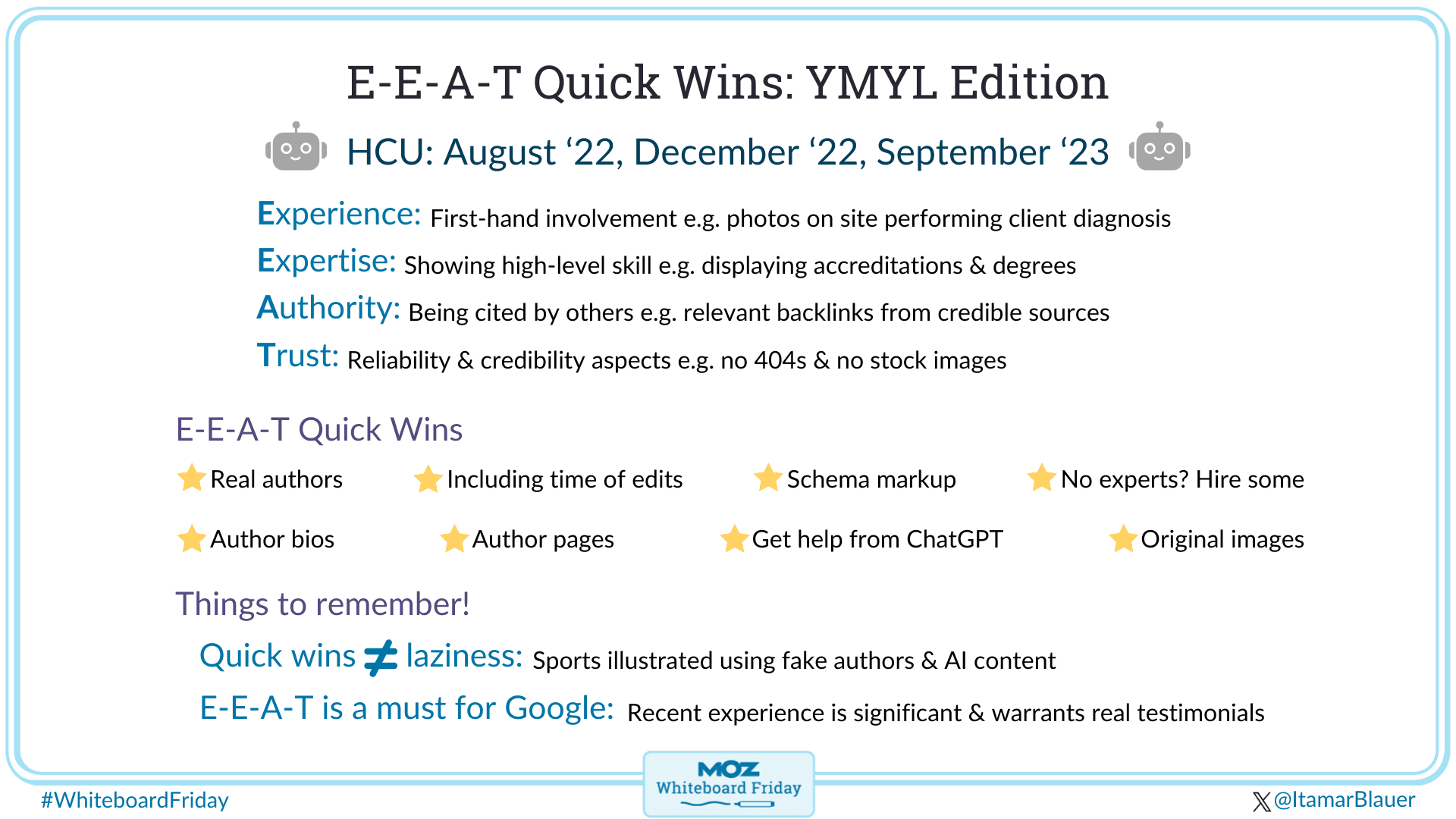 Welcome to Whiteboard Friday. I'm Itamar Blauer, and today I'm going to be talking about E-E-A-T quick wins that you can utilize to help your website appear more credible in the eyes of users and Google.